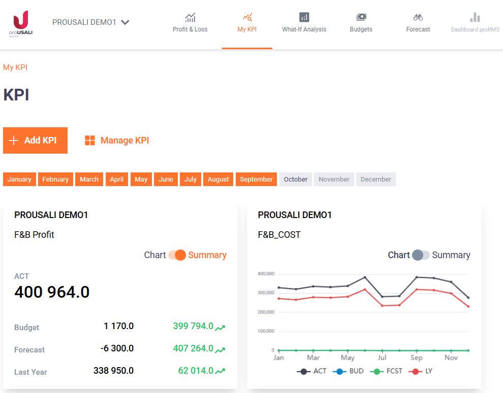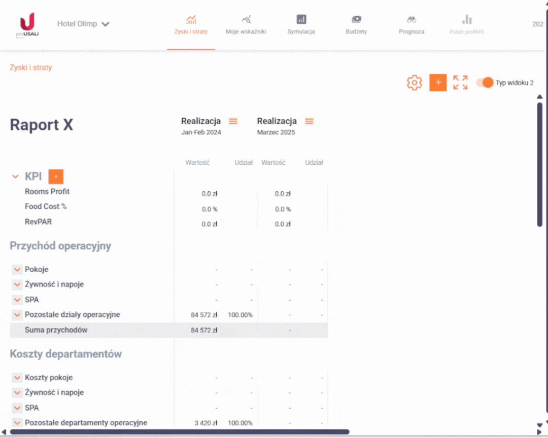 Możliwość korzystania z gotowych KPI lub tworzenia własnych, szczegółowe wskaźniki np. przychód na m², nadgodziny, koszty chemii w dziale pokojów